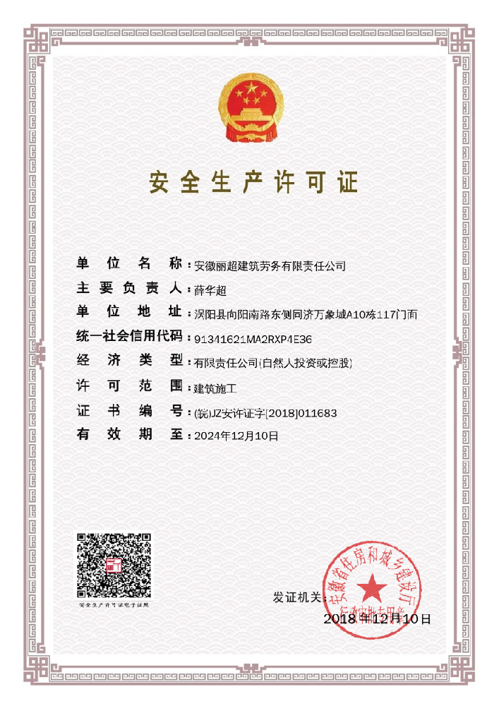 安徽丽超建筑劳务有限责任公司是根据安徽省建设厅《关于加强建筑劳务分包和用工管理的通知》(皖建【2004】1号)文件精神以及《建筑业企业资质管理规定》于2018年7月在涡阳县工商行政管理局注册设立。公司具有模板作业分包一级、金属焊接服务;水电、门窗安装服务,园林绿化工程、土石方工程、市政工程、体育场设施工程、外墙保温工程、混凝土预制构件工程施工。脚手架作业分包···